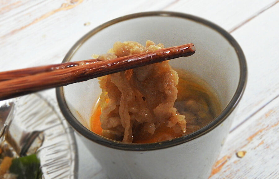 そのまま食べていてもおいしい「ゆず香る お家豆乳牛鍋定食」ですが、塩麴ダレにつけても◎。