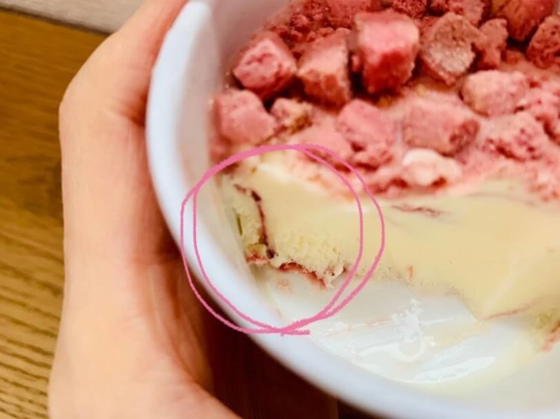 アイス部分はカシス果汁入りのストロベリーソースが織り交ぜられた純白のフロマージュアイスクリームです。