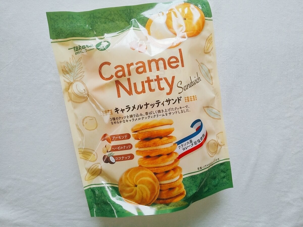 サンドされているのは、キャラメルとナッツを配合した香ばしいクリーム。クッキーにもクリームにもナッツが練り込まれた、ナッツ尽くしの仕上がりです。