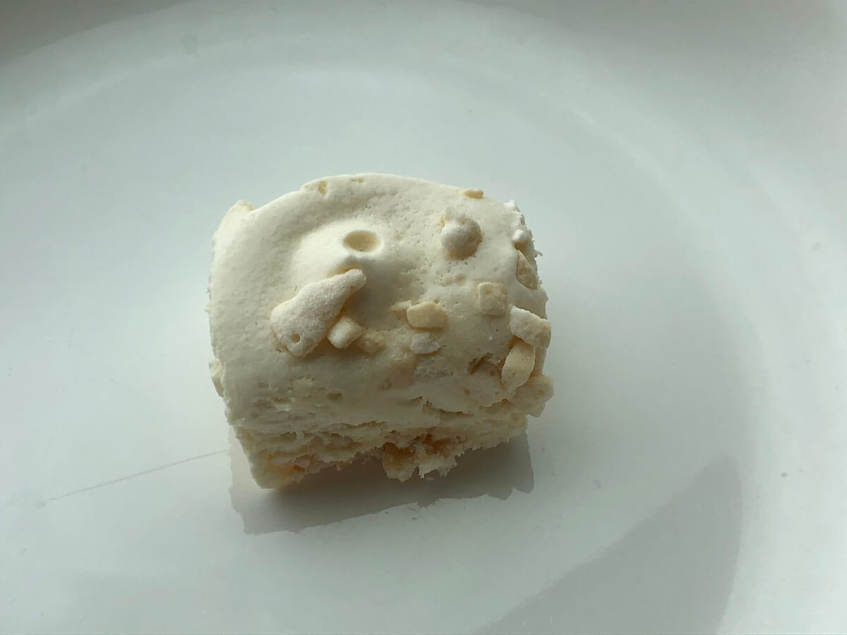 口の中に入れたらサクサクシュワっと溶けてしまいます。甘いのですが重くは感じられず胃もたれすることもなさそうです。