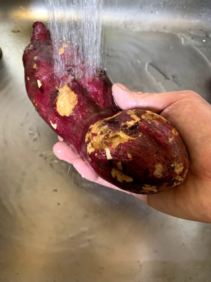 まずはさつまいもをしっかり洗います。ここでしっかり洗っておけば、皮ごと食べることも出来るのでお得です。
