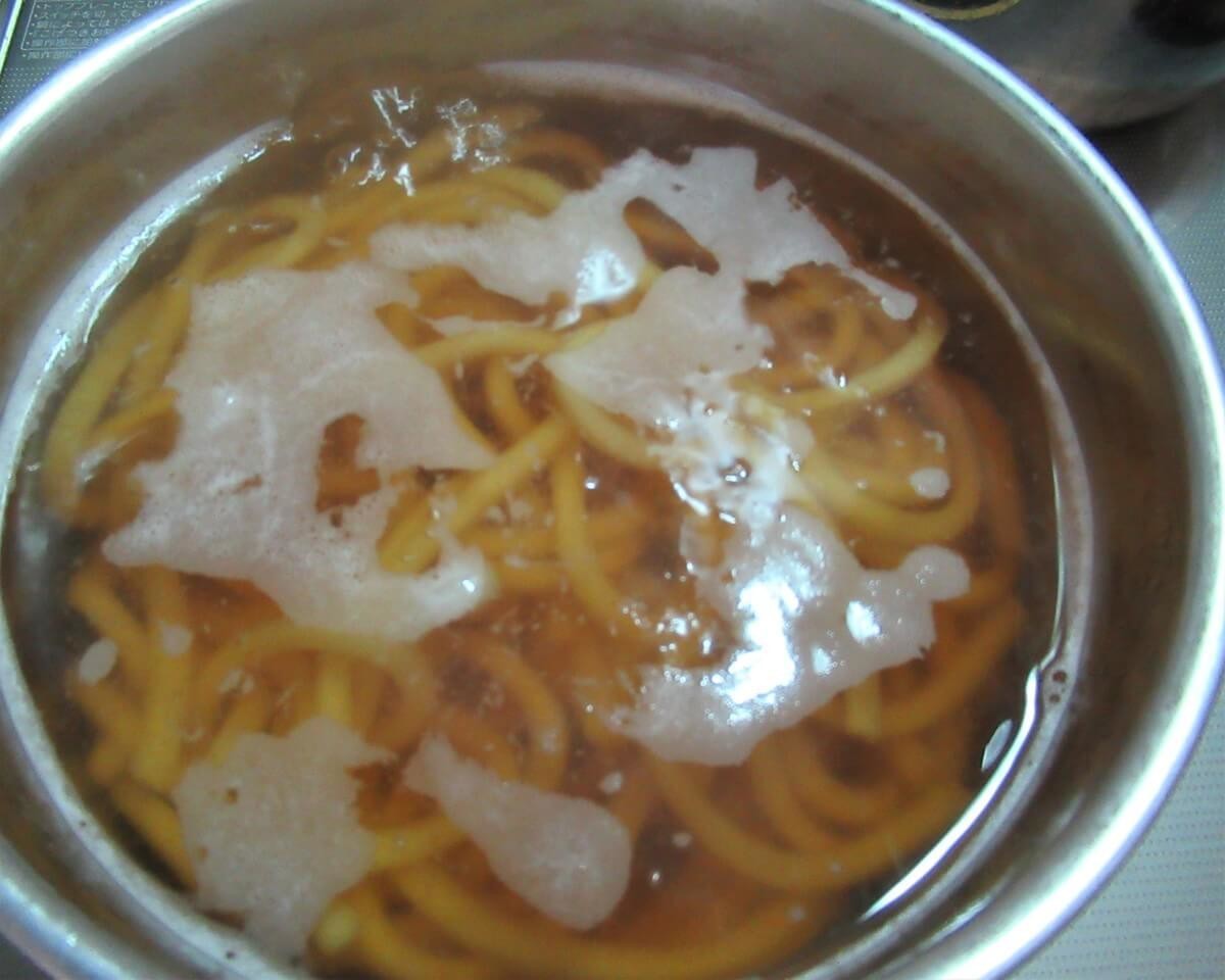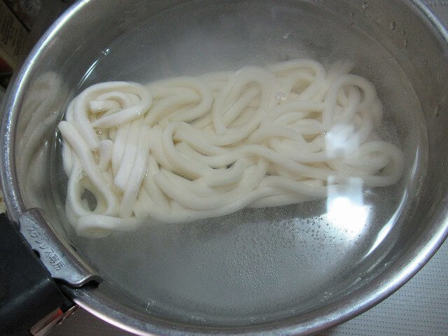 (3)(1)で沸騰させたお湯に冷凍讃岐うどんを1玉入れる。