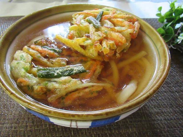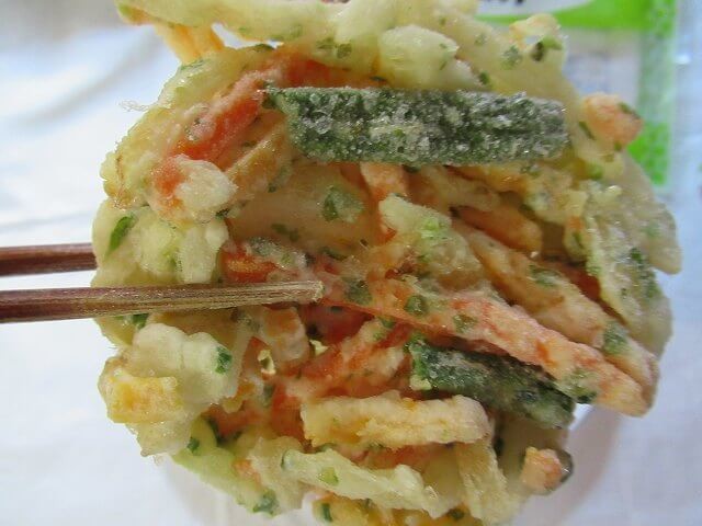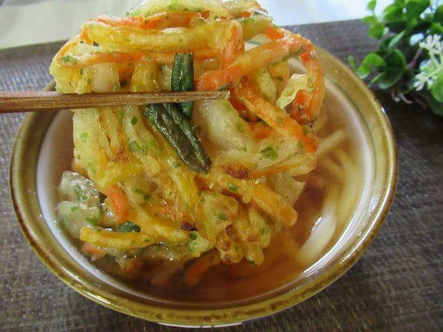 野菜かき揚げはボリュームがあります。また、かき揚げの衣がつゆを吸って膨れるため、おなか一杯になります。