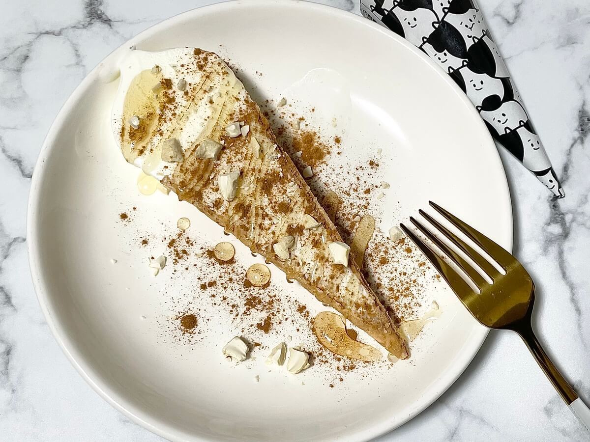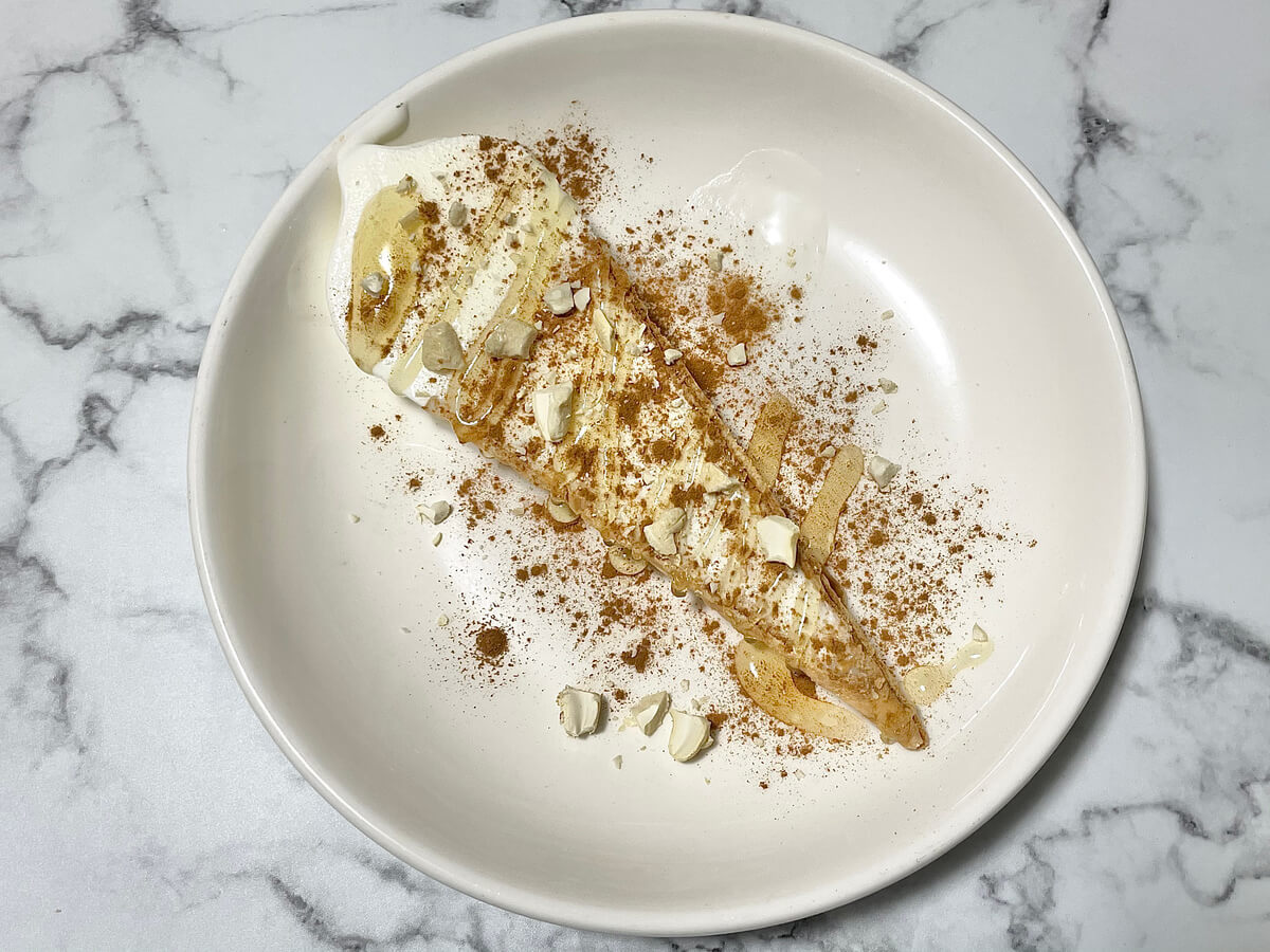 はちみつ、シナモンを好きな量かけて、上にカシューナッツをちりばめましたが、これが大正解! シナモンやナッツのほろ苦さで、大人な味わいに♪