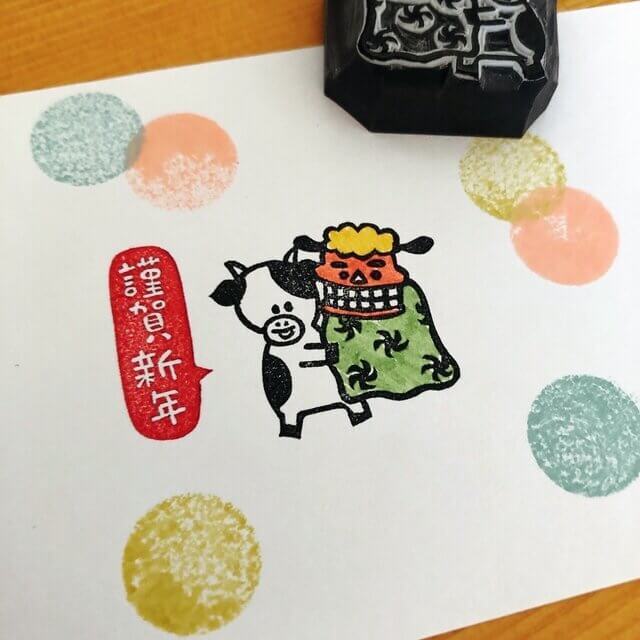 最初にご紹介するのは、「うしくんと獅子舞」を押すことができる消しゴムはんこです。 来年の干支が「牛」なので、年賀状やポチ袋にペタっと押すだけでお正月感が出てとてもかわいい仕上がりになります。