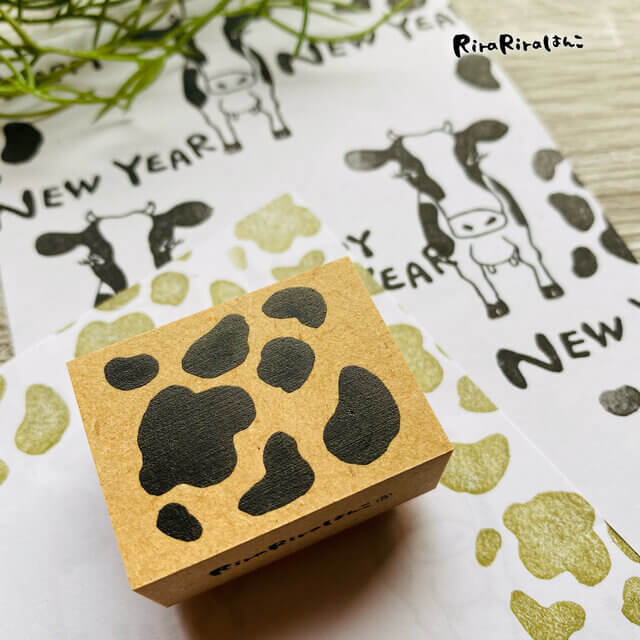 こちらは、年賀状を牛にしてしまう「牛柄」のはんこです。これまでは牛のキャラクターがデザインされたはんこでしたが、牛柄模様を押せるはんこ。牛柄を押して年賀状全体を牛にしてしまいましょう♪