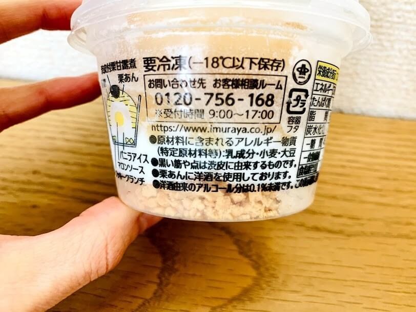 栗餡にラム酒を配合して大人な味わいに仕上げているそうですが、アルコールは0.1%未満でほぼ香りづけ程度なので、食べて酔っぱらうということはないと思います。心配な方は運転前などは控えましょう!