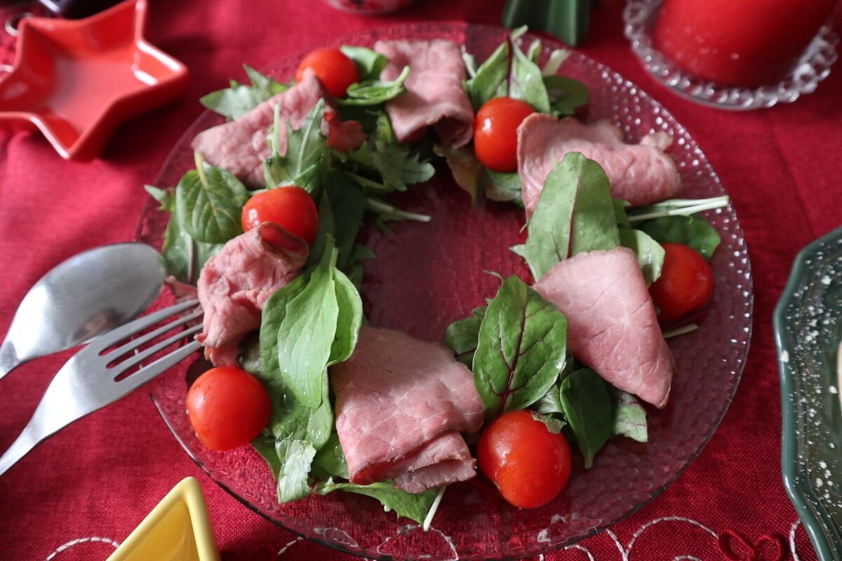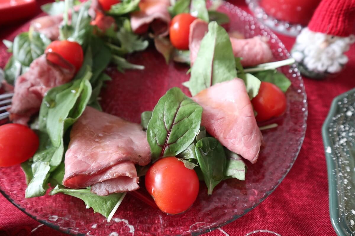 ローストビーフの華やかサラダ。 器にベビーリーフ(1袋)を円になるように盛り付けて、ローストビーフ、ミニトマト(3個半分に切る)をのせてたら完成です。 5分ほどで完成です。