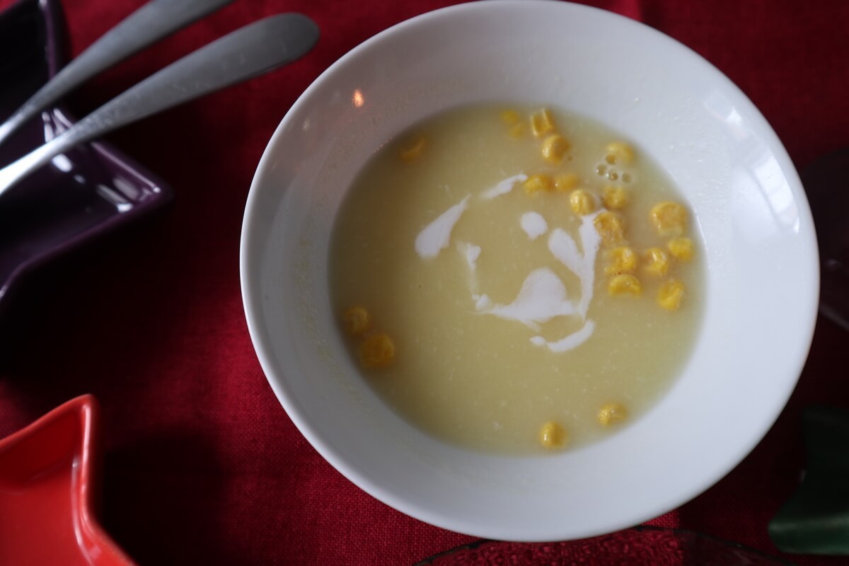 器にコーンポタージュを入れて、沸騰したお湯を加えて混ぜる。仕上げに生クリームを垂らせば完成。