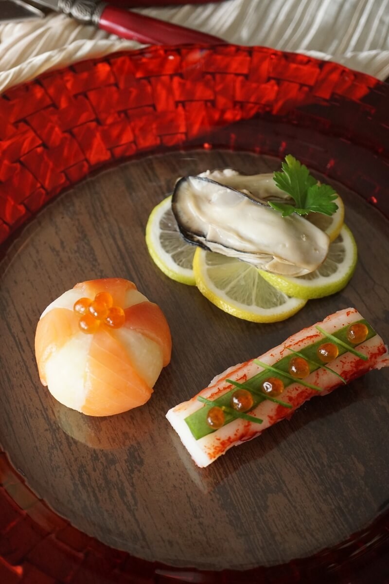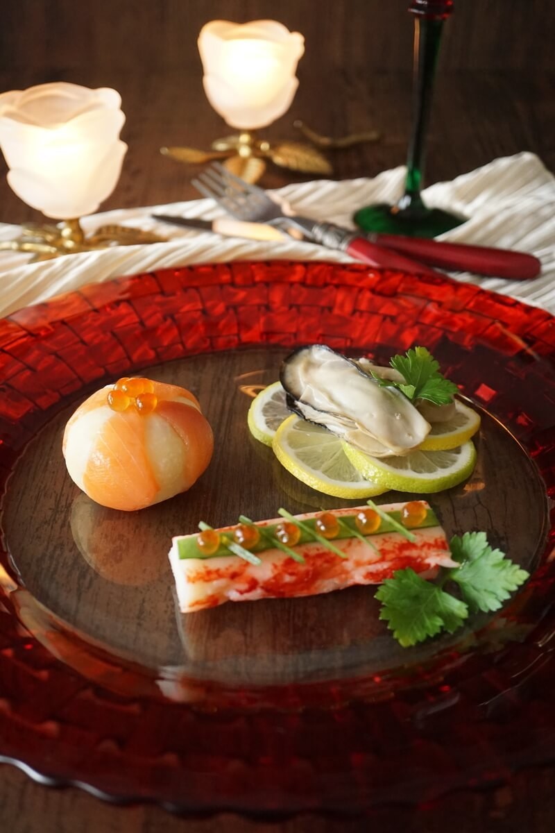 ひとつめはクリスマスツリーに飾るオーナメントに見立てた前菜です。