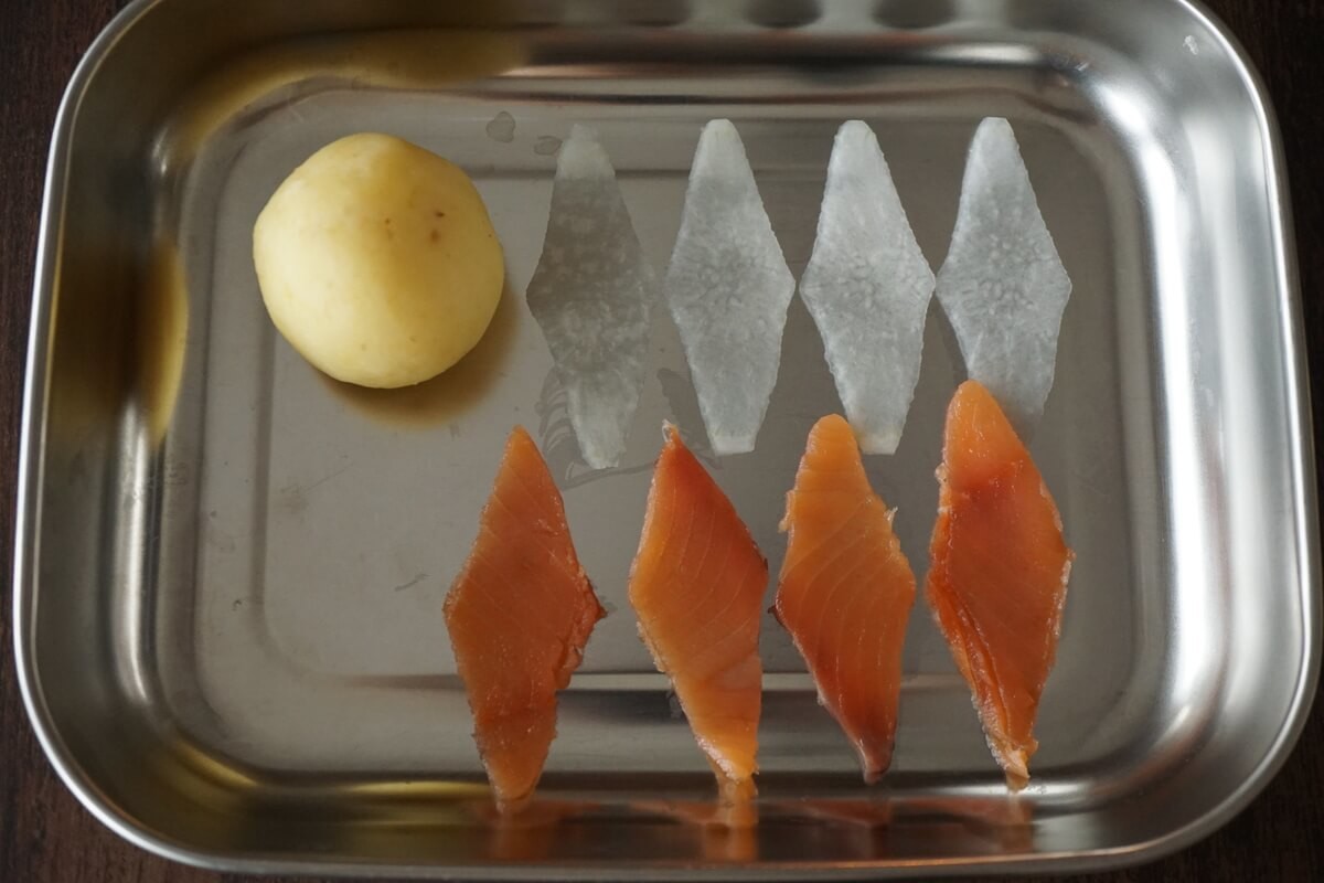 - スモークサーモン、ダイコンをひし形にカットします。(それぞれ4枚ずつひし形にカットしたものを用意します)