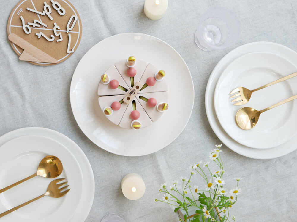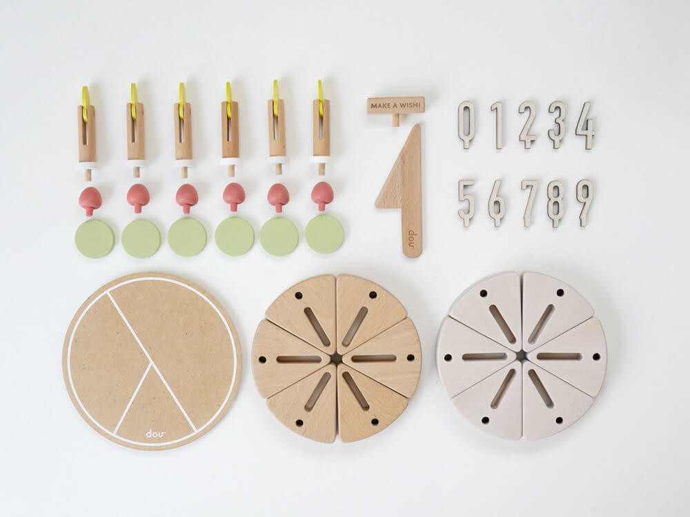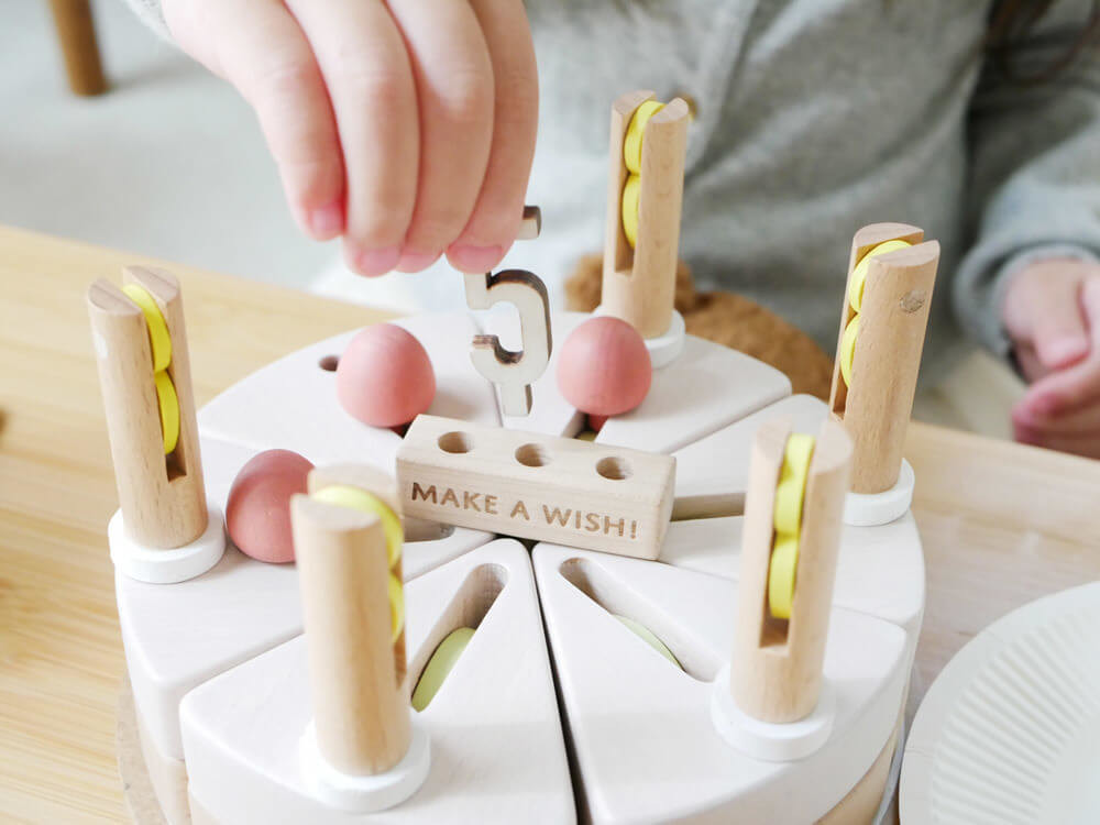 バースデーケーキをモチーフにした、木のおもちゃ「make a wish」。おいしそうなケーキにろうそくをたて、木のナイフで1切に分けることもできます。