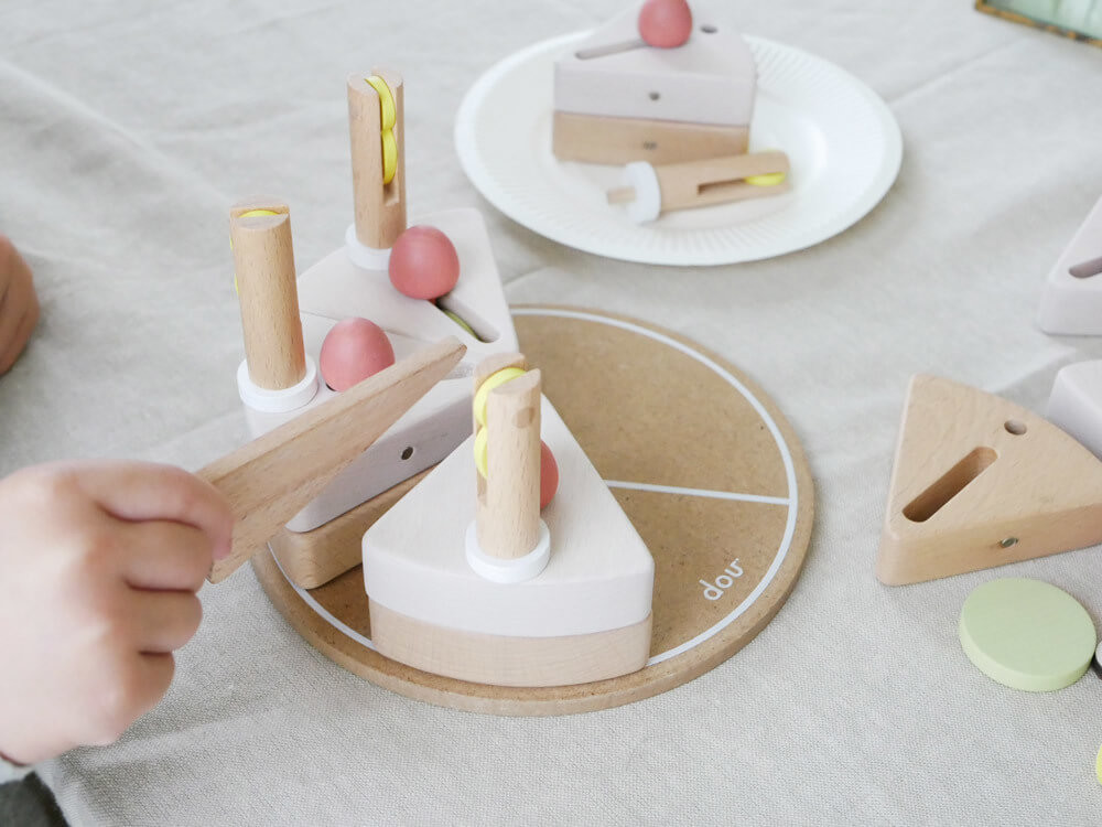 いちごやロウソクを飾り付ける、二層式のケーキの内側にフルーツを入れる、カッティングボードとケーキナイフを使ってケーキを1切ずつに分けるなど、おままごとだけでなく、パズル遊びの要素も踏まえています。
