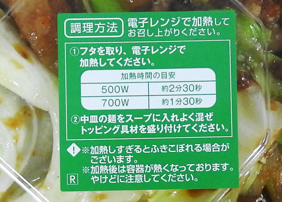 電子レンジで温める時は、ふたをはずしてそのまま電子レンジに入れるだけ。温め時間は、約2分30秒(500W)、約1分30秒(700W)です。