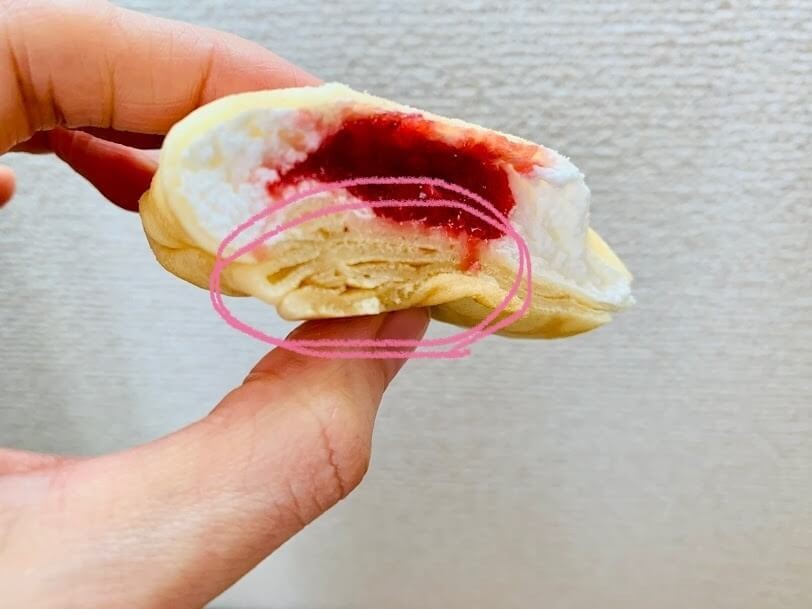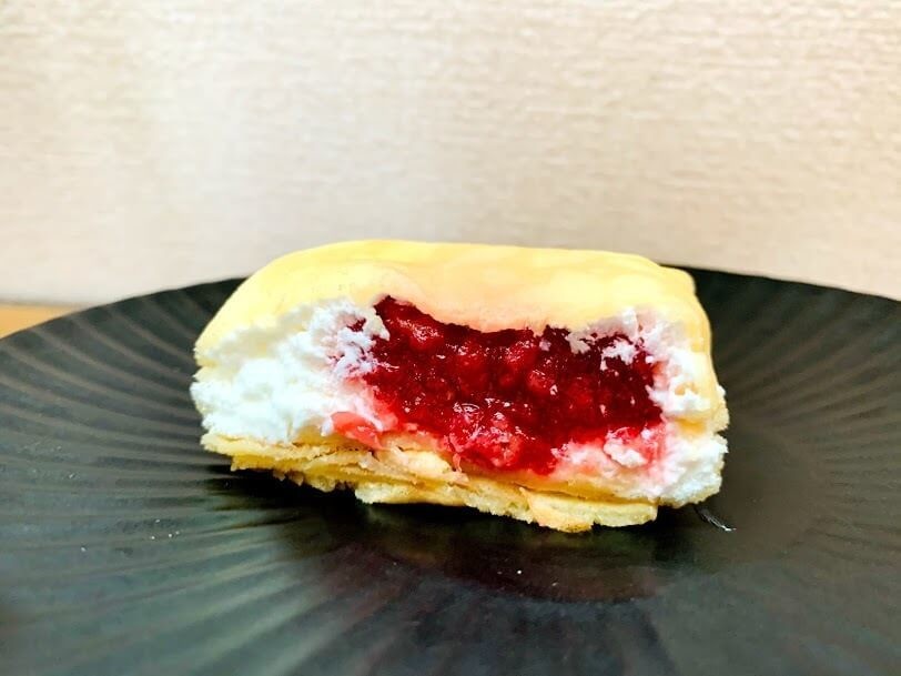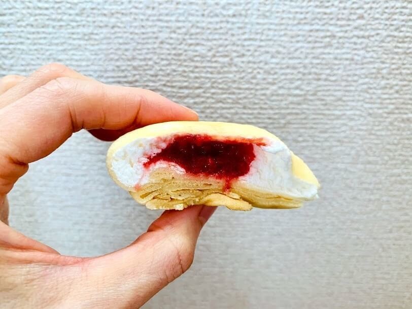 そしてこの苺ソース!!つぶつぶの果肉が惜しみなく入っていて、ソースというよりジャム!?果肉入りジャムを食べているみたいです。苺がジューシーで、甘酸っぱくてキュンとなっちゃう。それをミルククリームが優しく包み込んでいます。