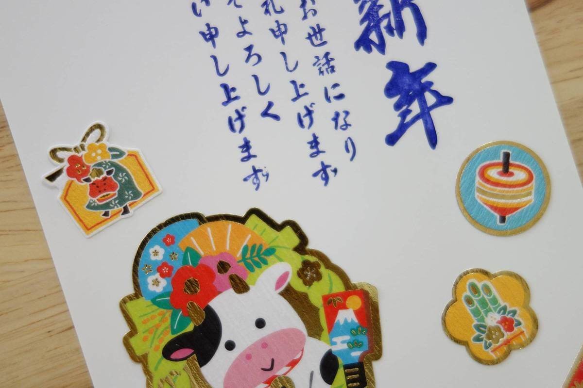 早速、手本のとおりに年賀状に貼ってみました。