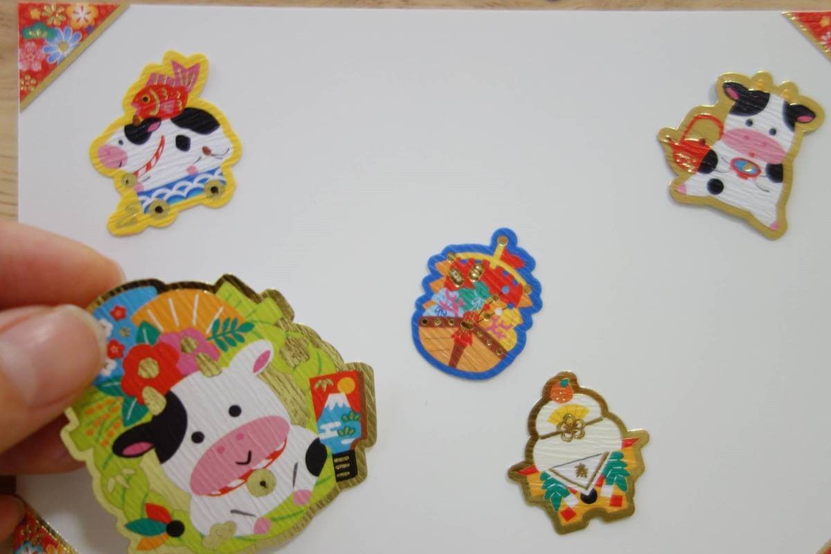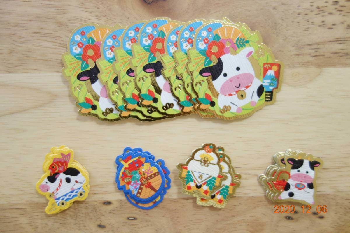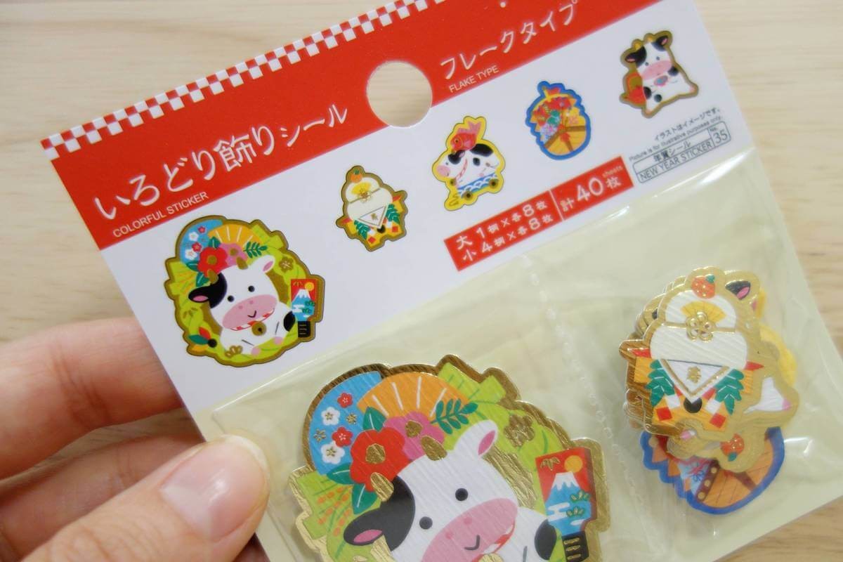 可愛い牛や鏡餅、宝船などのシールがそれぞれ8枚ずつ入っています。