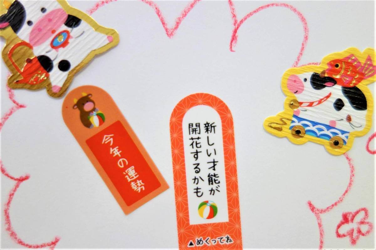 めくって楽しいおみくじタイプの年賀シールです。