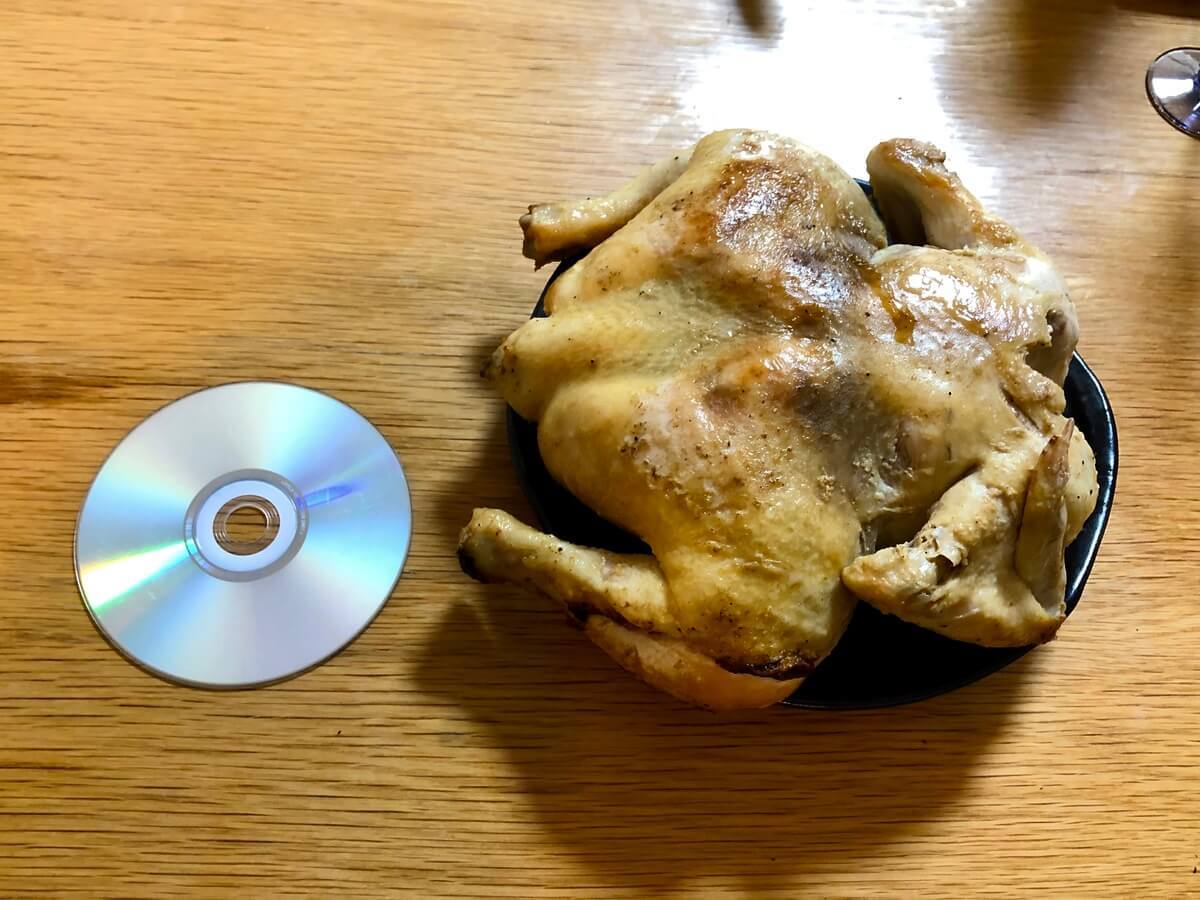 ローストチキンは大きく、我が家で1番大きい皿からもはみ出てしまいました。 比較としてDVDを並べますが、わかりますでしょうか。