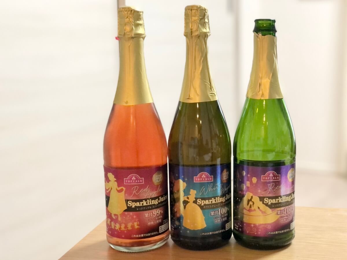 - 【トップバリュ ディズニーデザインスパークリングジュース(フランス産)】(左から)レッドアップル、ホワイトグレープ、レッドグレープ 750ml 各458円(本体価格)