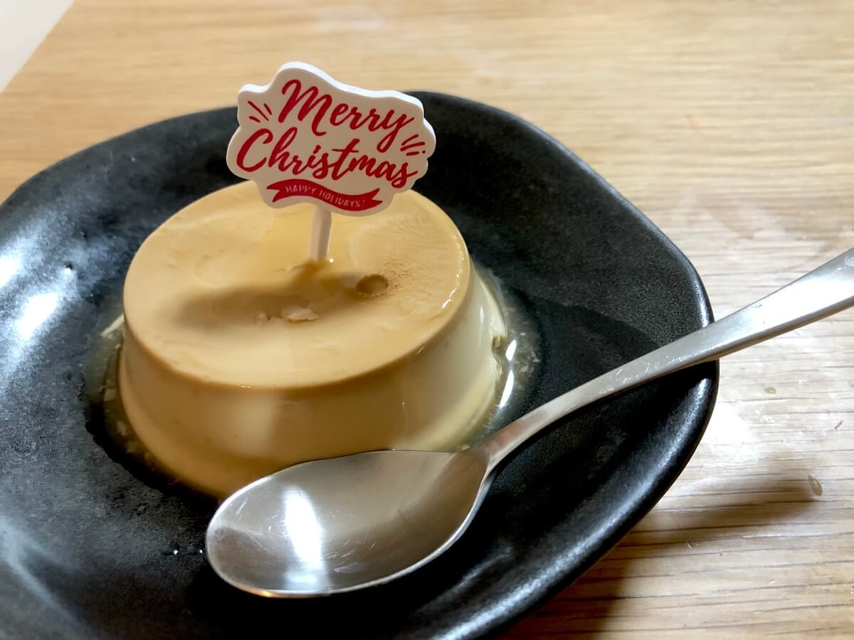 ただし文字だらけのパッケージや、茶碗蒸しみたいな見た目なのが、クリスマスデザートとしては少しだけ残念なんですよね。 そこで提案したいのは、クリスマスの飾りをつけることです。