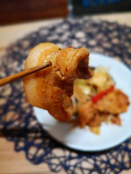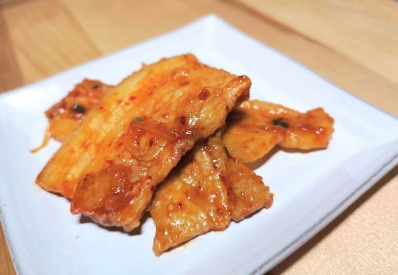 味見してみたところ、全体的にマイルドでとっても食べやすく、豚バラの脂身部分から出た旨味がジュワっと甘くて美味しいです。本当に思ったよりも辛くありません!