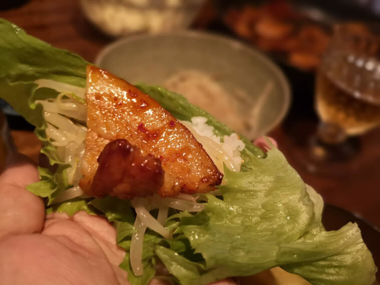 お肉のみだと、かなりしっかり味がついてる感じなので、サンチュやレタス、ナムルなんかと一緒にくるんでいただくと最高に美味しいです!