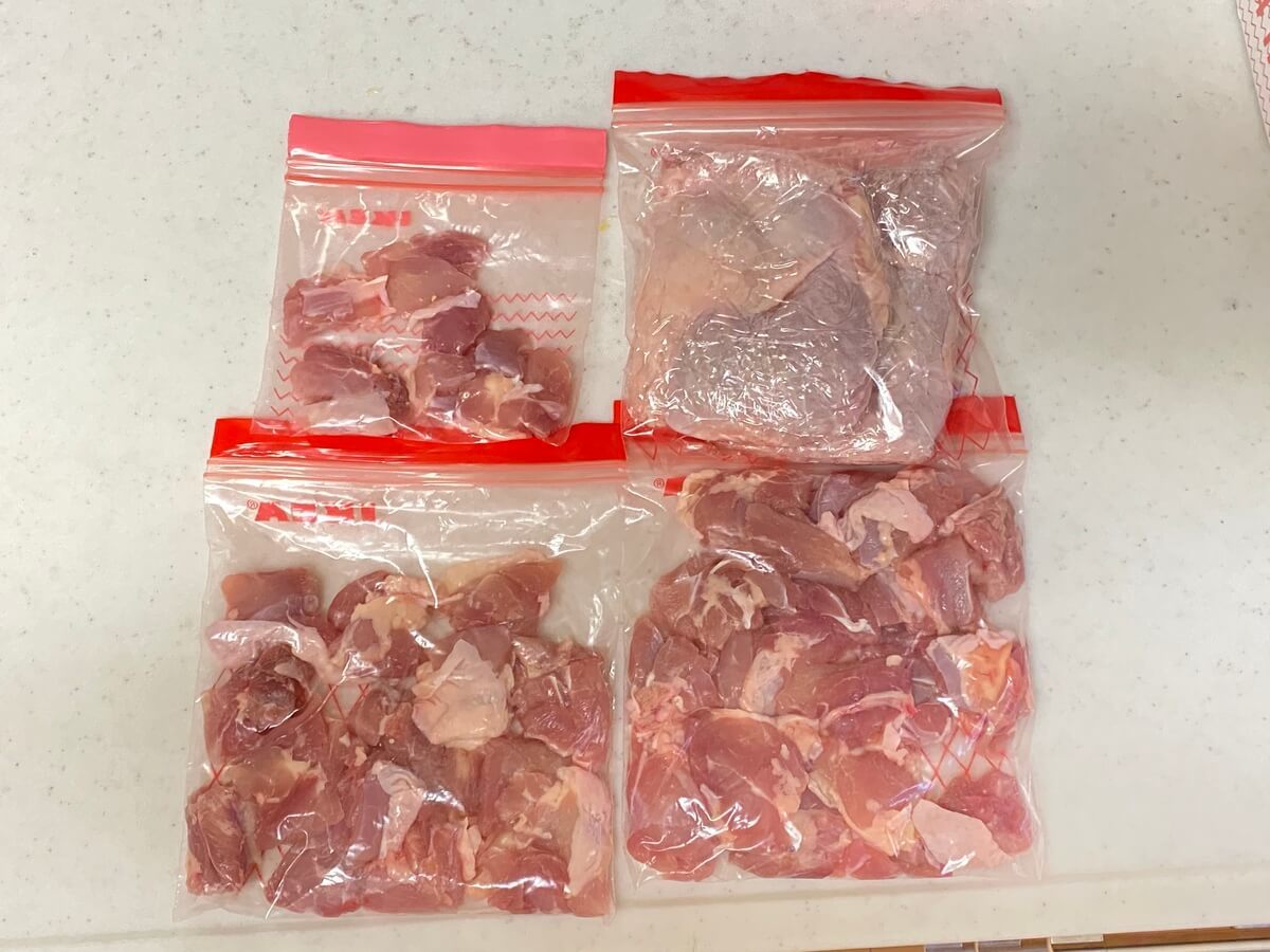 いつもなら一口大にカットして冷凍しているのですが、お肉を購入した時点ではまだクリスマスメニューは決めていないので、あえてカットせずにそのまま冷凍しています。