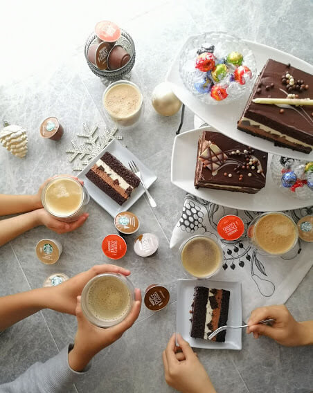 「ネスカフェ ドルチェ グスト ミニミー」で作る4つのコーヒーに、ホリデーシーズンを思わせるラグジュアリーなスイーツを合わせて。今年は家族とおうちで贅沢に楽しんでみませんか。