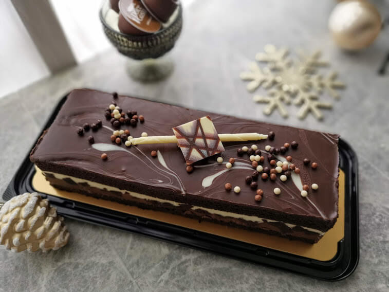 おうちパーティーを楽しむには、やっぱりケーキ!ということで合わせたのが、コストコホリデーシーズン限定商品の「タキシードケーキ」です。濃厚な生チョコを重ねたようなケーキのあいだには、マスカルポーネクリーム。贅沢な一品です♪