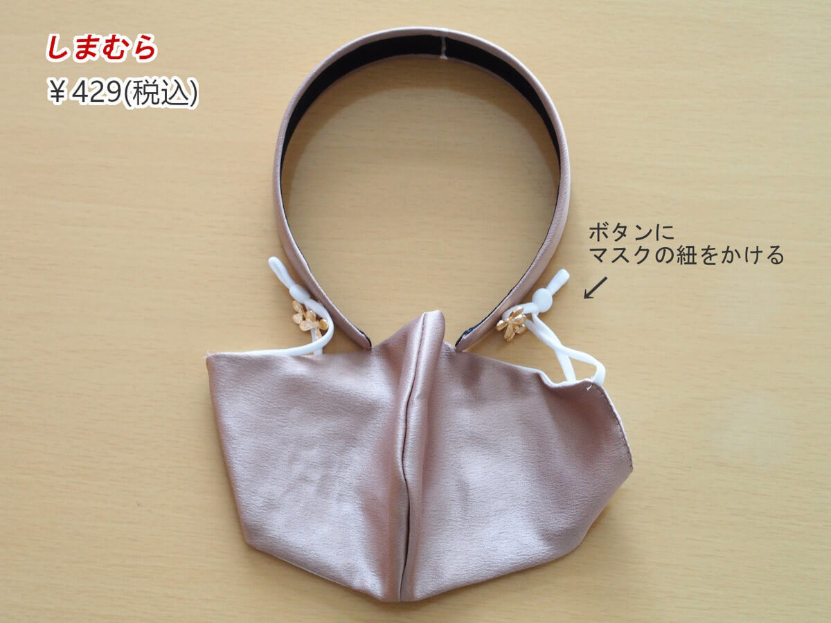 カチューシャのボタン部分にマスクの紐を掛けることで、耳への負担を軽減できます。