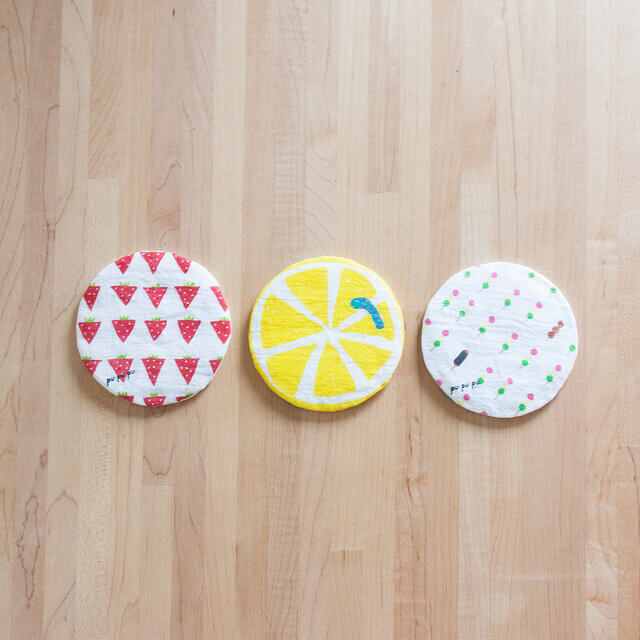 リピーターさんのリクエストにより制作されたという、可愛らしいコースターです。中にキルト芯が入ったコースターは、もっちりした質感でしっかりした作りになっています。