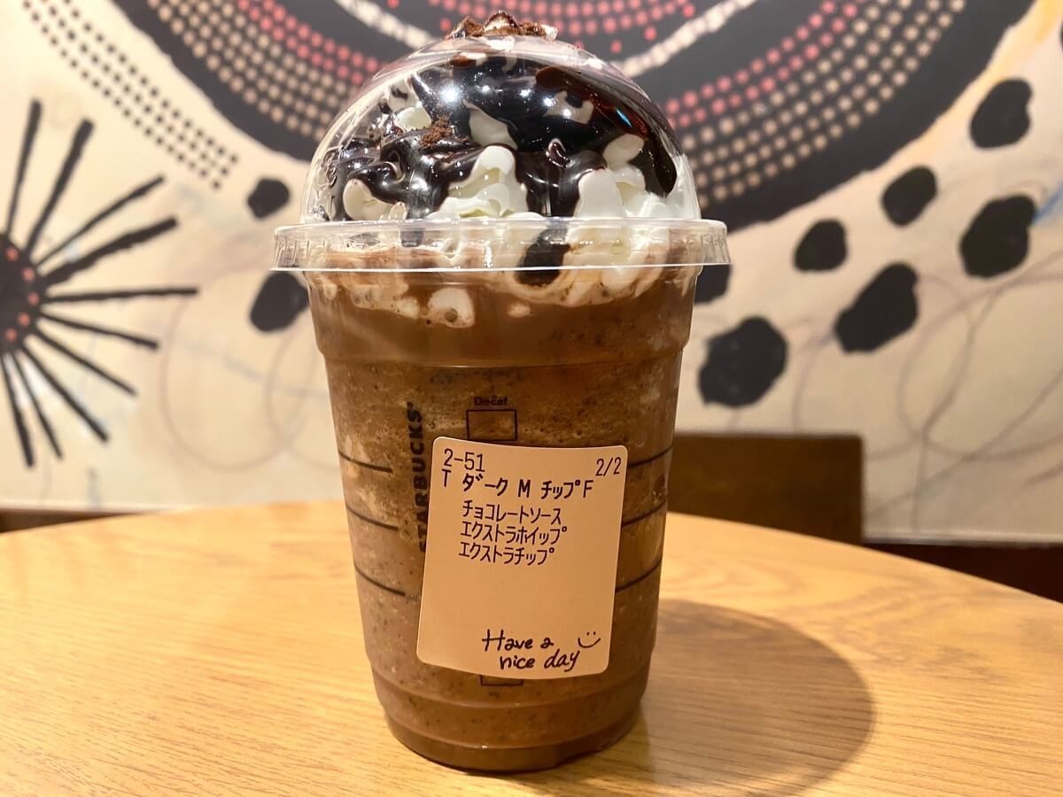 ダークモカチップフラペチーノ®︎は、コーヒーベースのフラペチーノ®︎にチョコチップ、ダークチョコレートパウダー、チョコレートチップをブレンドして作られています。