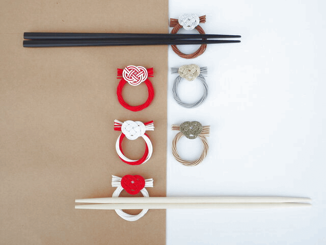 最初にご紹介するのは、水引を使用して作られたミニしめ縄の箸置きです。カラーは紅白とゴールドとシルバーがあしらわれているナチュラルカラーがあります。