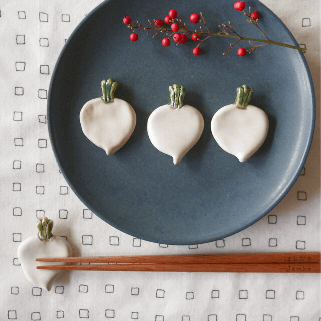 最後にご紹介するのは、カブをモチーフに作られた箸置きです。食べ物がデザインされているだけに、これまで紹介した箸置きのなかでは一番食卓に馴染む箸置きかもしれませんね。