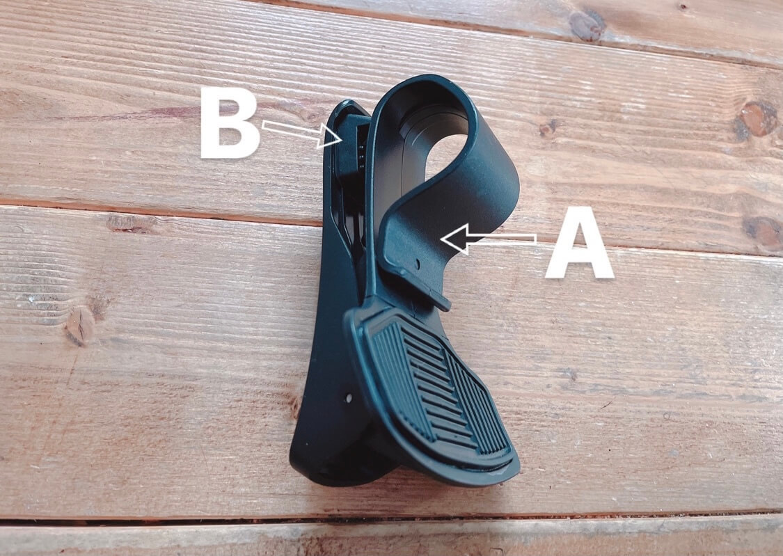 本品のAの部分を広げダッシュボードなどの厚み(約4cmまで対応)のある場所に固定します。Bの部分をスマートフォンの幅に広げて挟みます。