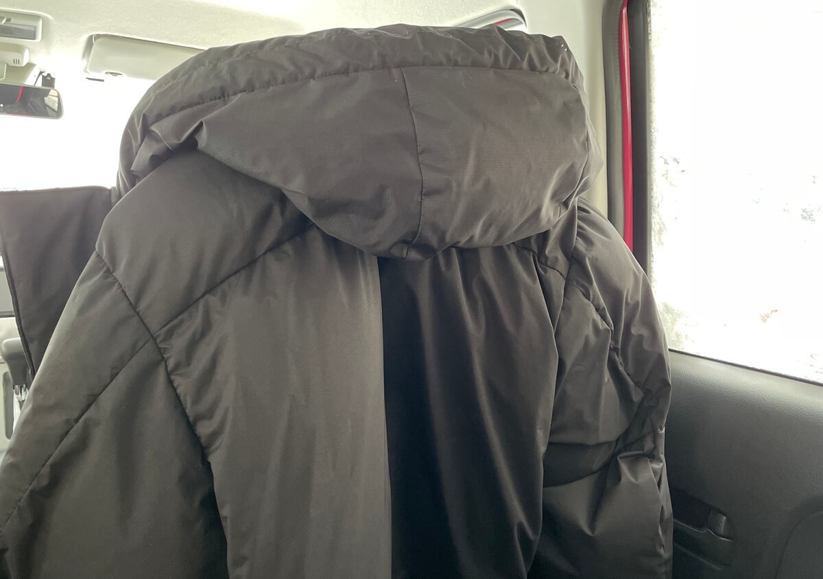 早速ハンガーを取り付けてみました。ヘッドレストを少し上に引き上げはめ込みました。豪雪地帯に住んでいるので冬場は厚めのアウターばかり着ます。