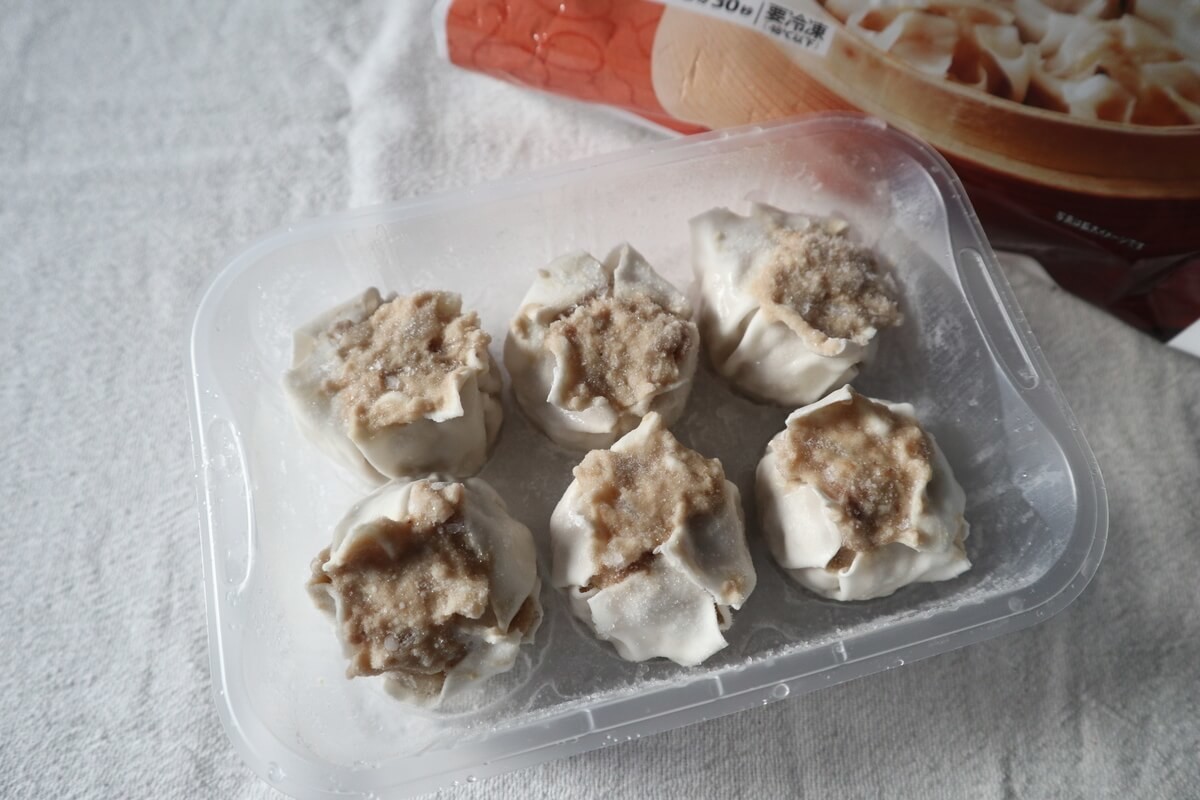 ラップの上に、片栗粉を塗った面を下にして置き本格焼売(冷凍のまま)を裏返しておきます。