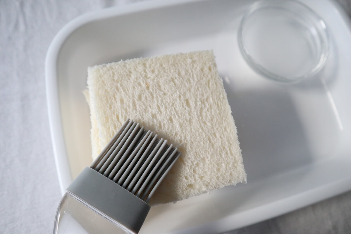 食パン(4枚)に片面だけ、片栗粉(大さじ1/2)と水(50ml)合わせたものを刷毛でたっぷり塗ります。