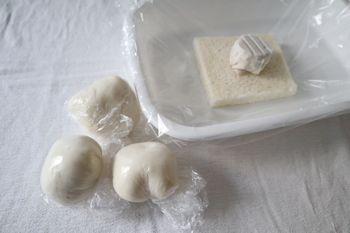 ラップを使って食パンで焼売を包みます。その際にギュッと食パンどうしをくっつけて焼売をしっかり包みます。