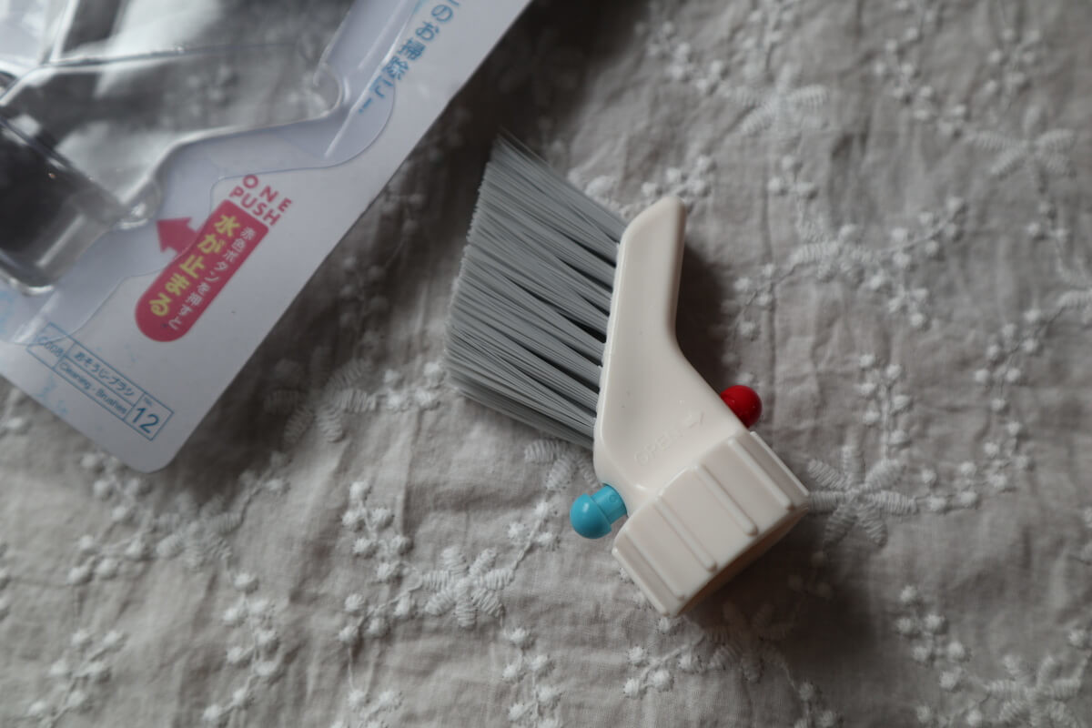 ダイソーの中でもいくつか種類があるペットボトルにつけるブラシですが、この商品の特徴は栓の開閉ボタンがついていることです。
