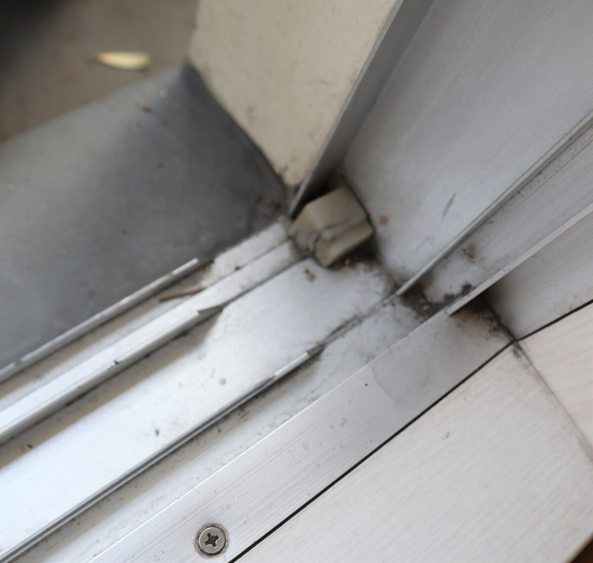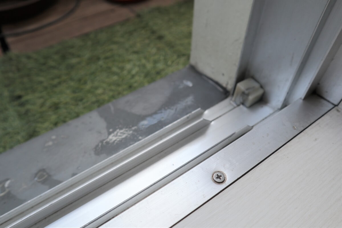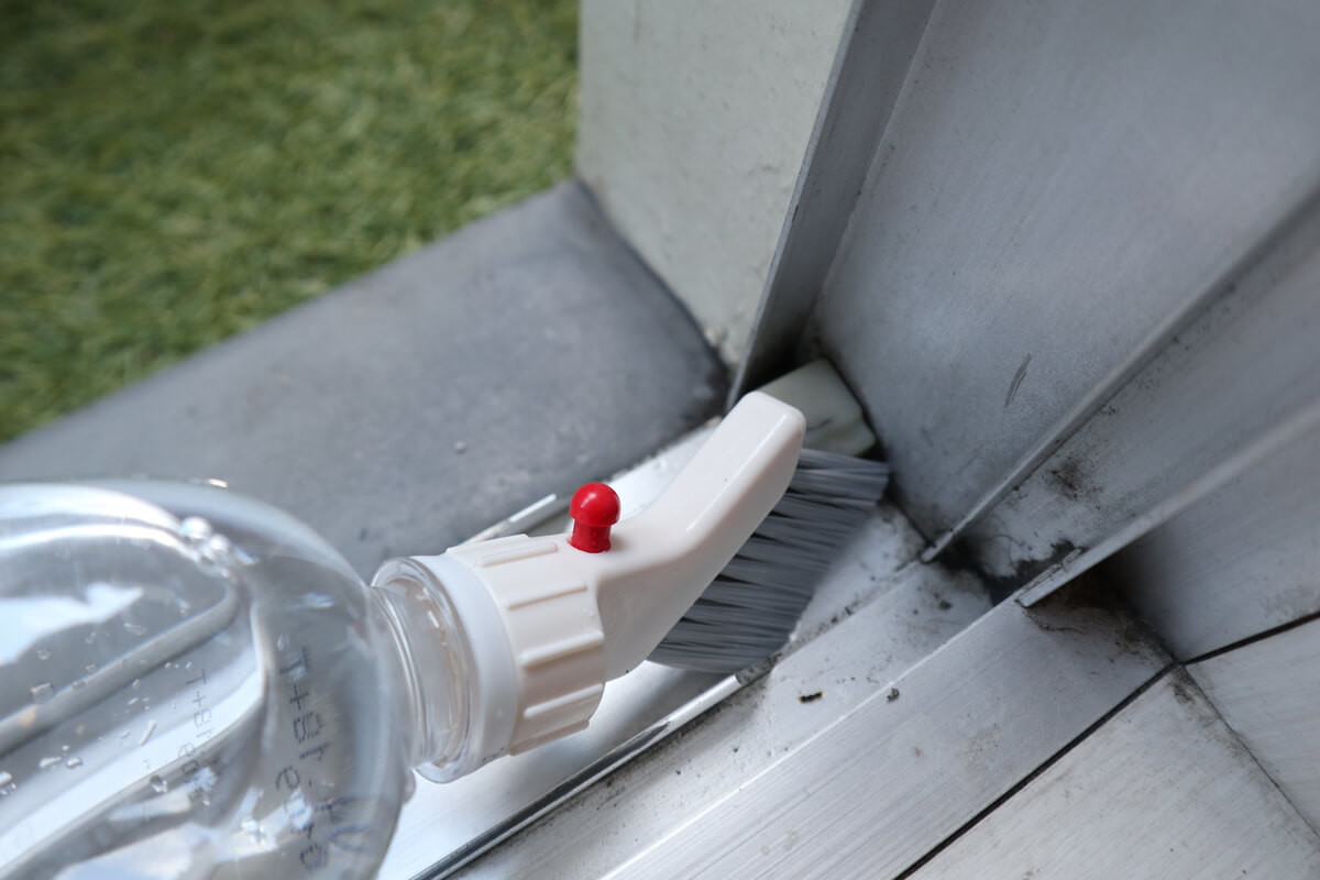 サッシレールをブラシでこすります。先がとがっているので、端の細かい部分の汚れも掃除できます。
