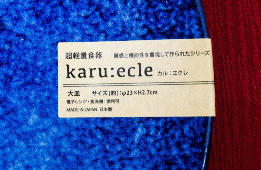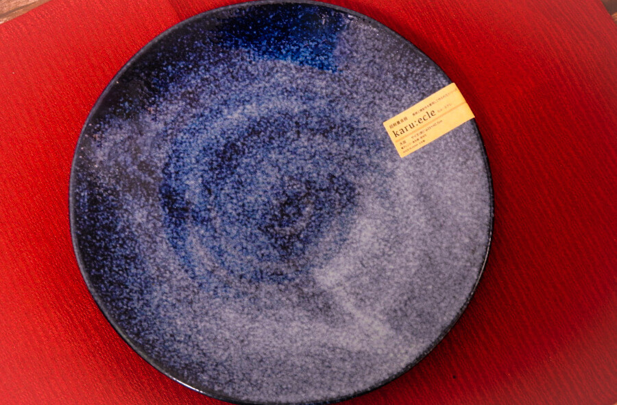 カル:エクレシリーズ内でいくつかのデザインがありますが、なんだか高級感のある色合いの「窯変紺の大皿」を発見。見た目は重厚感がありますが、軽い……!ホント、軽い……!