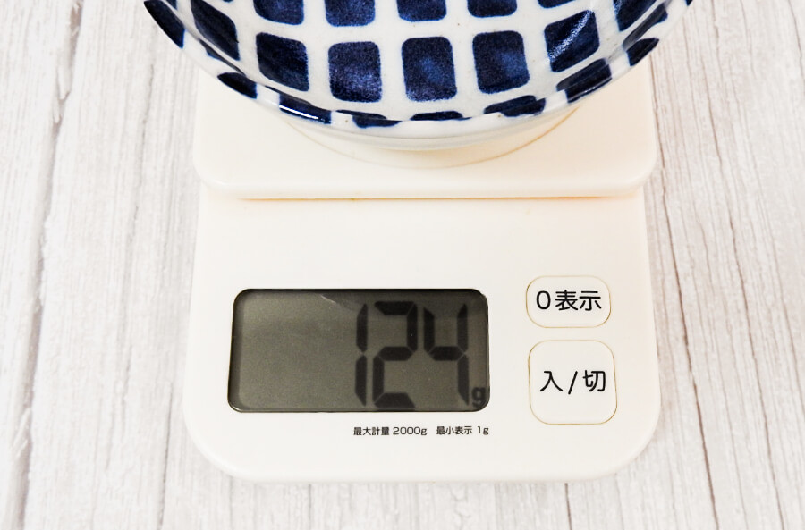 まずは、ニトリデコホーム「カル:エクレ 青格子の小鉢」の重量を測定……124g。