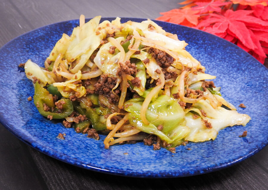 野菜炒めをのせてみました。ただの野菜炒めなのにちょっとおしゃれに見えますし、SNS映えもしそうな大皿ですね。