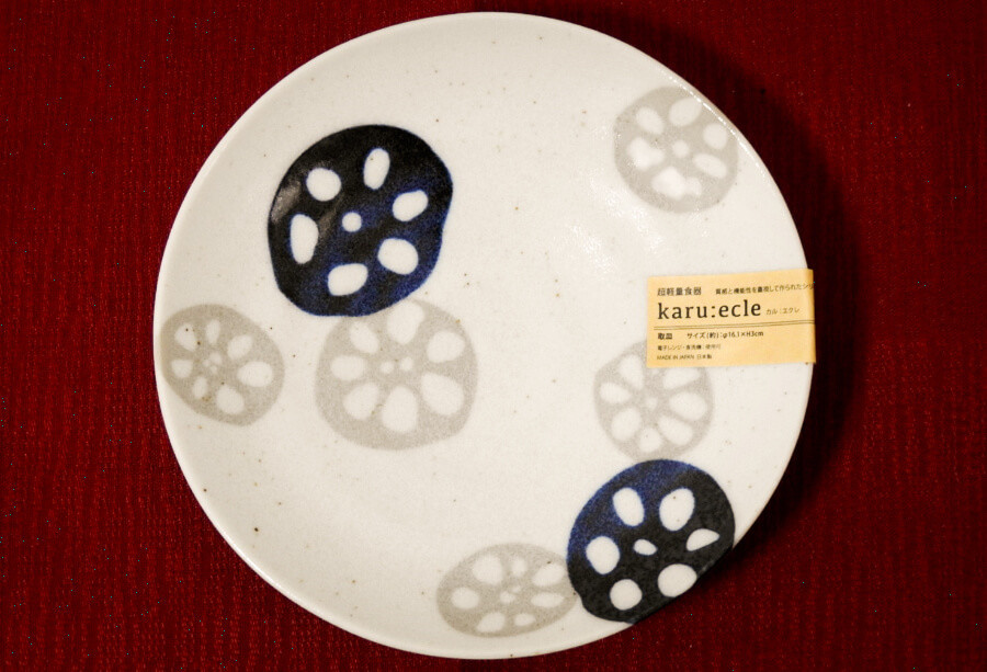 和っぽい柄ですが、よくみるとレンコン……な「カル:エクレ 2色蓮根の取り皿」304円(税込)。煮物をのせるのに良さそうです。