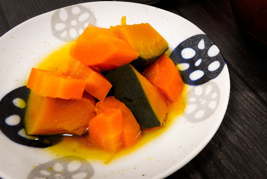 かぼちゃの煮物用に使ってみましたが、色の対比がキレイです。すっと溶け込んでいくような落ち着いた色合い。個人的には好きです。