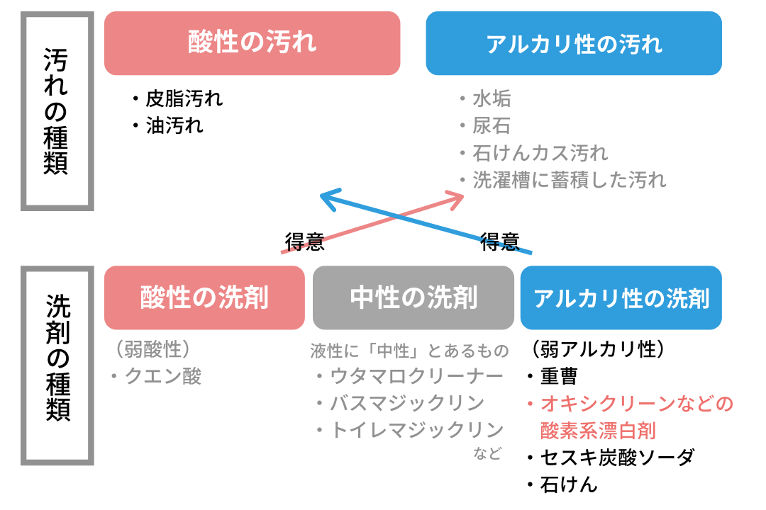 オキシクリーンは、弱アルカリ性の洗剤です。酸性の汚れに対して、アルカリ性で中和させることで汚れに対処します。 ですので油汚れや皮脂汚れといった、いわゆる"酸性の汚れ"に効果を発揮します。