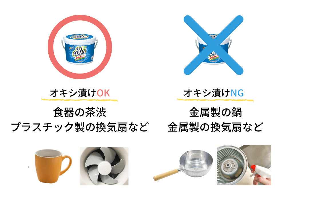 ⇒食器、プラスチック製のタッパーや換気扇などオキシクリーンNG