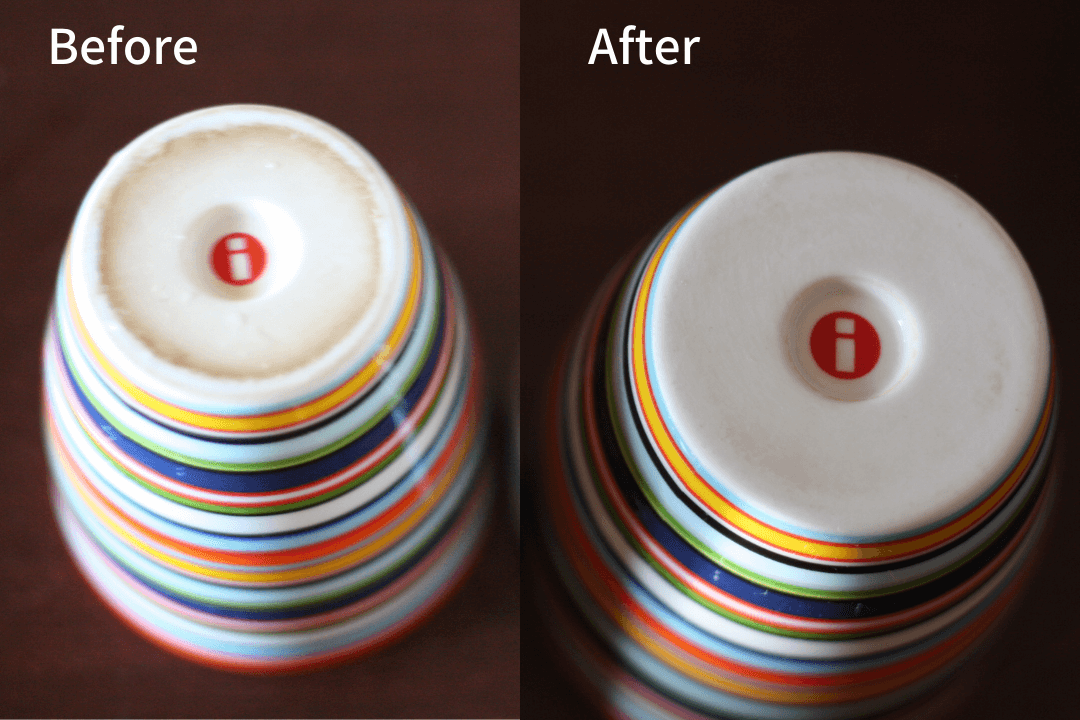 普段は全然気にしていなかったのですが、マグカップの裏側に、なにやら覚えのない汚れがついていました。